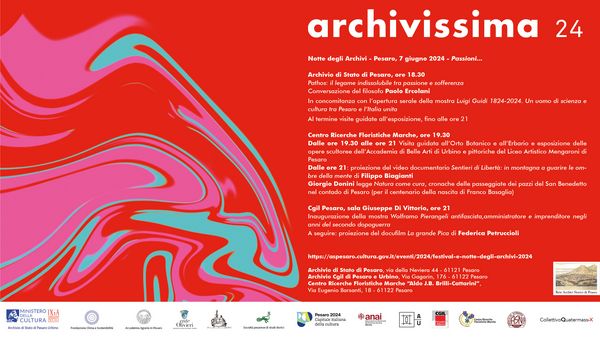 The Historical Archives Network of Pesaro proposes for Archivissima 2024 The Festival and the Night of the Archives, a series of events: exhibitions, guided tours, video screenings, united by the single theme "Passions...".