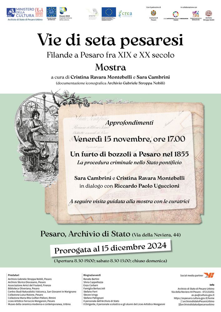 The exhibition “VIE DI SETA PESARESI. SPINNING MILLS IN PESARO BETWEEN THE 19TH AND 20TH CENTURY”, curated by Cristina Ravara Montebelli and Sara Cambrini, set up at the State Archives of Pesaro, under the aegis of the international project Aracne Project, has met with considerable public success, thanks not only to the new theme and the documents on display, but also to the richness and originality of the exhibition, with objects and artistic artefacts on loan from various city institutions and collectors.