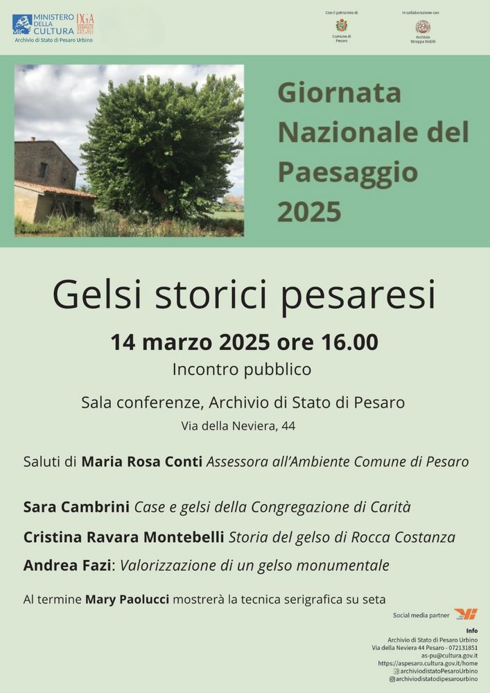 Venerdì 14 marzo, alle ore 16, in occasione nella Giornata nazionale del paesaggio, l'Archivio di Stato di Pesaro propone un incontro pubblico dedicato ai Gelsi storici di Pesaro. Dopo i saluti istituzionali dell'assessora all'Ambiente Maria Rosa Conti, interverranno Sara Cambrini, che parlerà di alcune case con gelsi della Congregazione di carità di Pesaro, Cristina Ravara Montebelli, con un contributo dedicato al gelso di Rocca Costanza, e Andrea Fazi, che parlerà dell'opera di valorizzazione di un gelso monumentale di Pesaro. Al termine: dimostrazione di tecnica serigrafica su seta a cura di Mary Paolucci.