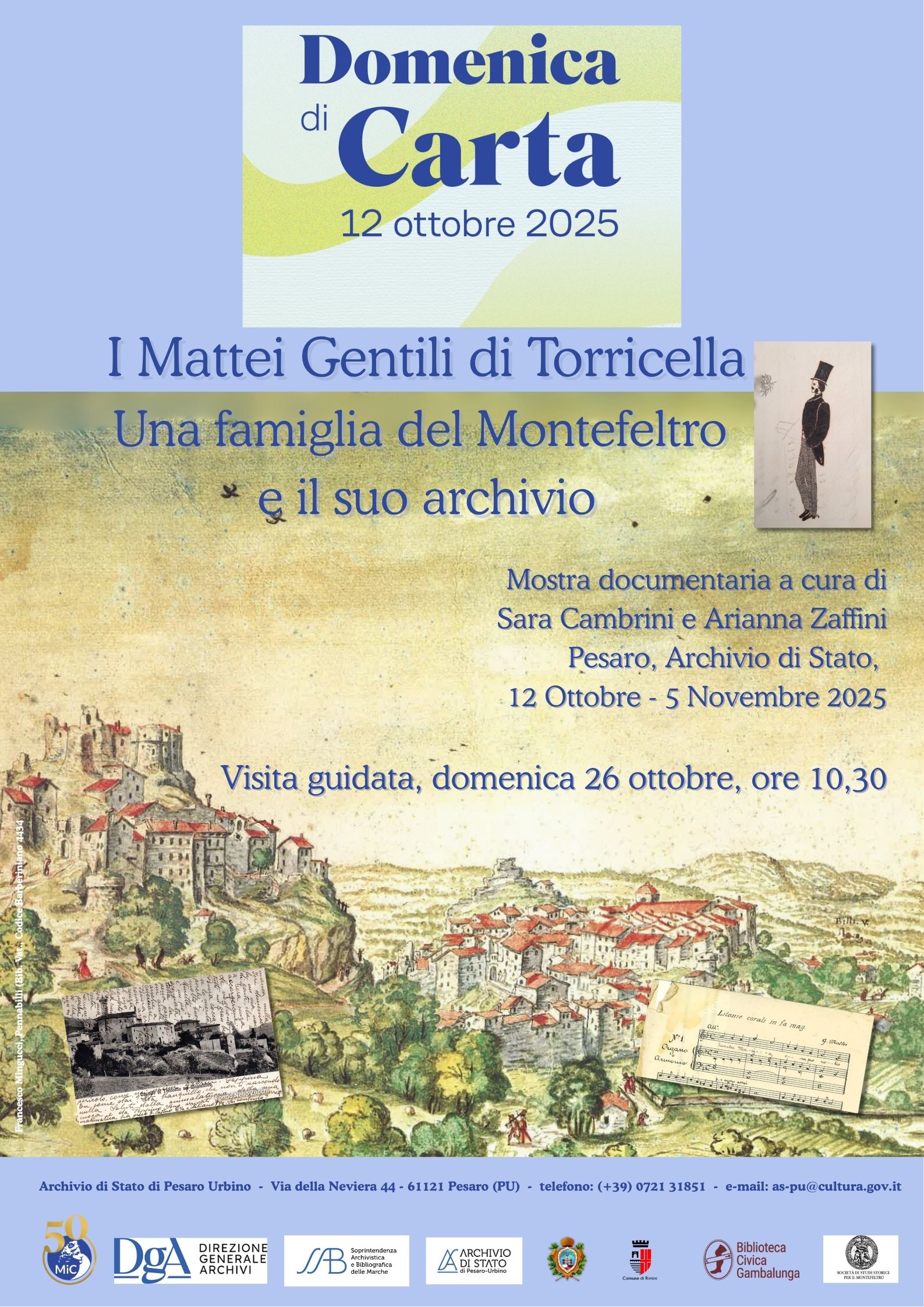 Domenica 26 ottobre, alle ore 10,30, a grande richiesta, l'Archivio di Stato di Pesaro organizza una visita guidata alla mostra I Mattei Gentili di Torricella: una famiglia del Montefeltro e il suo archivio, insieme alle curatrici della mostra, Sara Cambrini e Arianna Zaffini, con la partecipazione di Luigi Mattei Gentili di Pennabilli, uno dei prestatori privati che ha contribuito ad arricchire iconograficamente l'esposizione, grazie alla varietà di fotografie ed altri documenti di famiglia esposti.